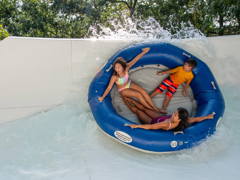 Thunder Rapids, a group favorite, is a 550-foot-long, 14-foot-wide flume propelling a five-person raft, and is the wildest water ride of its kind in the western U.S.